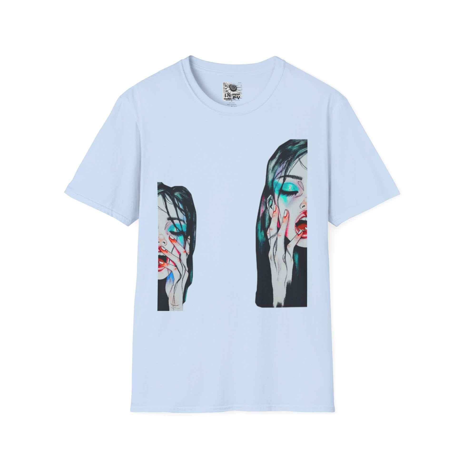 A soft, airy tee that wears like a quiet confession. The lightweight 100% ring-spun cotton feels gentle against skin while the bold, painterly portrait print brings an edgy, introspective vibe to everyday outfits. Two mirrored faces—paint-smudged, half-hidden—sit centered on the front, creating a cinematic pause that draws the eye and holds it. Wear it with lived-in denim and a worn-in jacket for gallery nights, late cafés, or slow city walks when you want your clothes to speak without shouting. Breathable and responsibly made, this shirt blends artisan expression with everyday comfort.