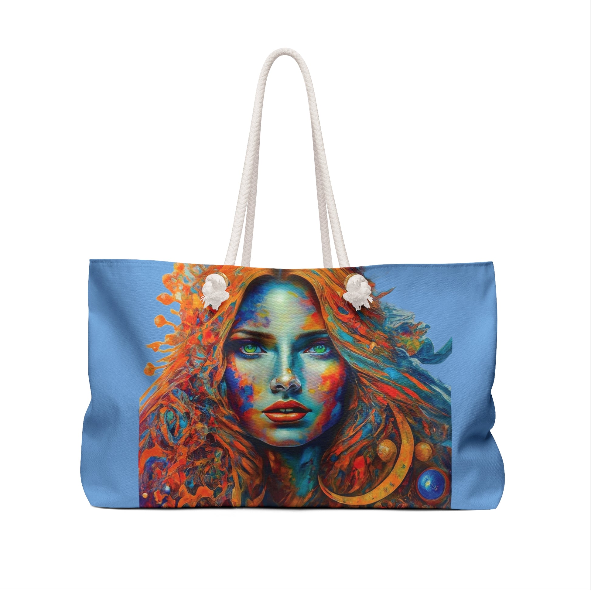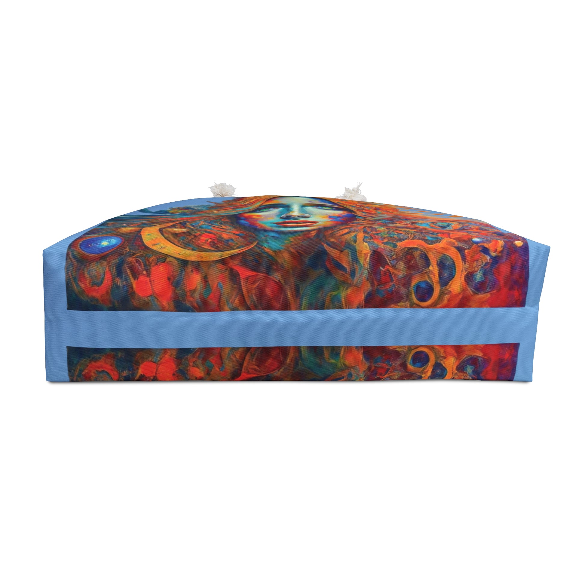 Our oversized Weekender Tote is perfect for making a unique fashion statement. The wide-mouthed, durable bag holds a generous amount of personal items and is easily held by its thick rope handles. This eye-catching piece adds a touch of artistic flair to any casual outfit.